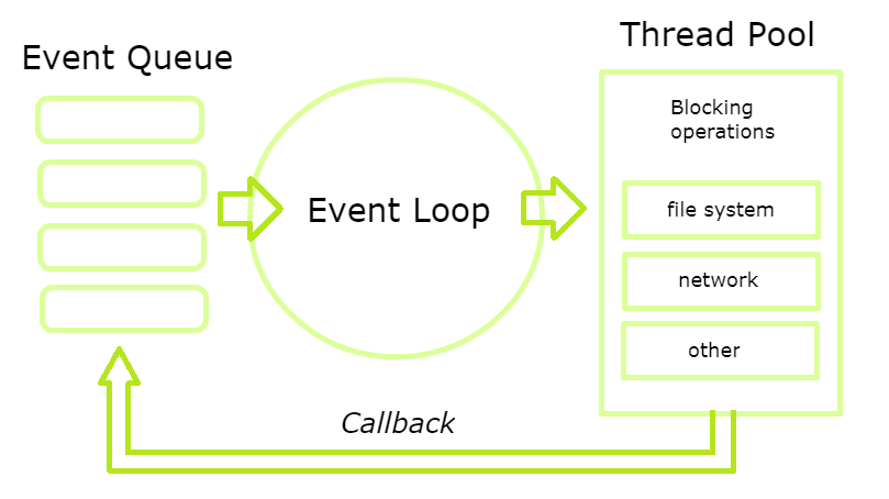 요청이 들어오면 요청 메세지를 Event Queue에 넣어주고, 들어와 있는 작업들을 Event Loop가 순차적으로 Thread Pool에 있는 Thread에 작업을 할당해주고 작업이 끝난 이벤트들을 감지하여 해당되는 Callback함수를 다시 Event Queue에 집어넣습니다.