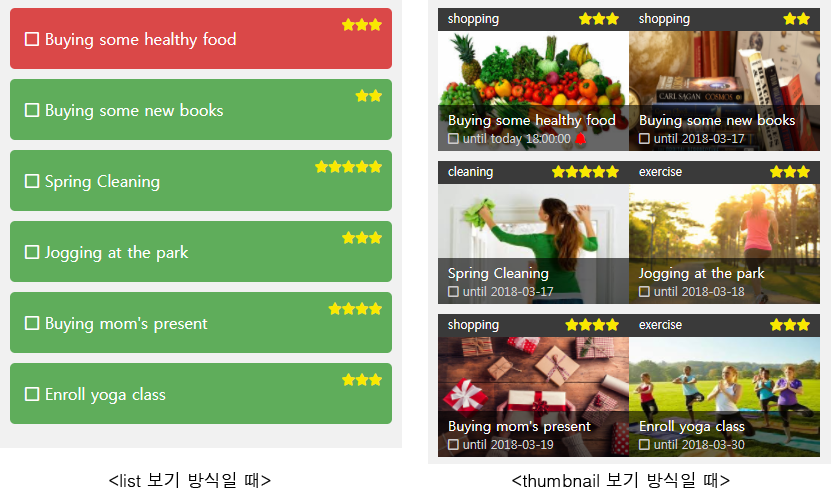 todo 항목 리스트는 ul 태그를 사용하였고, 리스트 방식과 썸네일 방식 두 가지 화면을 보여주려고 하는데, 각각 방식마다 보여주는 정보와 태그 구성이 달라서 ul 태그를 두 개로 나누었습니다. ul 태그의 v-if와 v-else지시어를 통해 사용자가 선택한 view 방식에 맞는 리스트를 보여줄 수 있습니다.