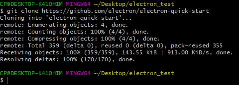 간단한 프로젝트 생성을 위해 먼저 electron_test라는 폴더를 생성 후 깃헙을 통해 일렉트론 프로젝트를 생성합니다.