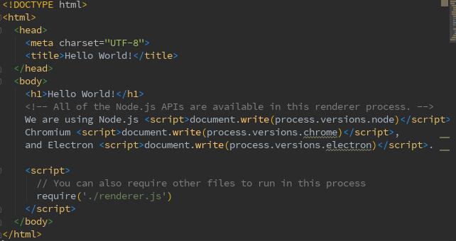 일반적으로 우리가 이미 알고 있는 html파일이며 <script>로 js파일을 require함으로써 불러온 js파일로부터 렌더러 프로세스를 이용할 수 있습니다.
