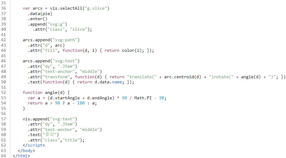 변수vis 저장된 태그 내(<g transform=”translate(225,225)”></g>) 에서 모든 <g class=”slice”></g> 요소를 선택하고 [line36]