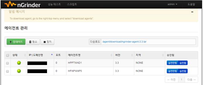 라. Agent 실행 후 Controller에서 우측 상단 메뉴의 “에이전트 관리”를 선택하면 아래와 같이 연결된 Agent 목록을 볼 수 있습니다.