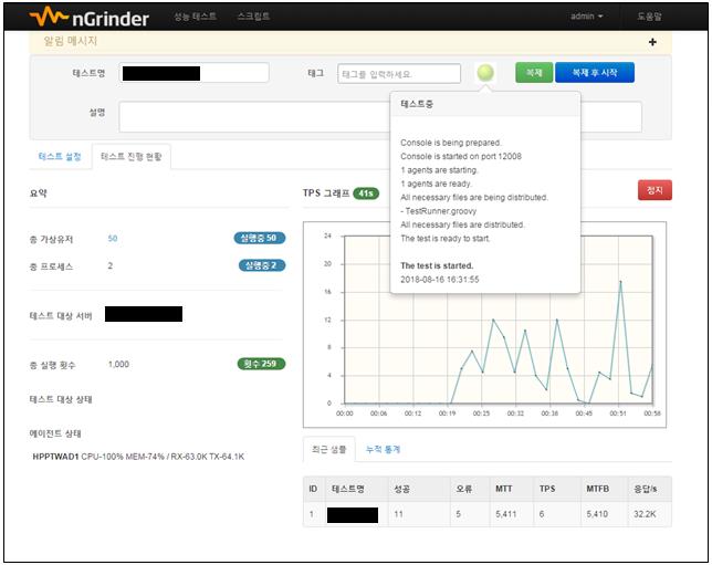 성능테스트 수행 중 상단 우측 공 위에 마우스 커서를 올려 놓으면, 팝업 창이 나타나 테스트 진행 메시지를 나타냅니다. 또한, 테스트 진행 현황 탭에서 현재 진행 중인 테스트 상태를 실시간으로 확인할 수 있습니다.