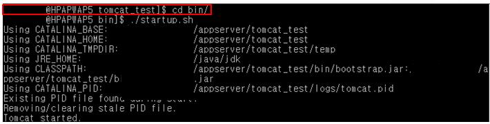 다. ${TOMCAT_HOME}/bin/startup.sh(리눅스) 또는 ${TOMCAT_HOME}/bin/startup.bat(윈도우) 파일을 실행합니다.