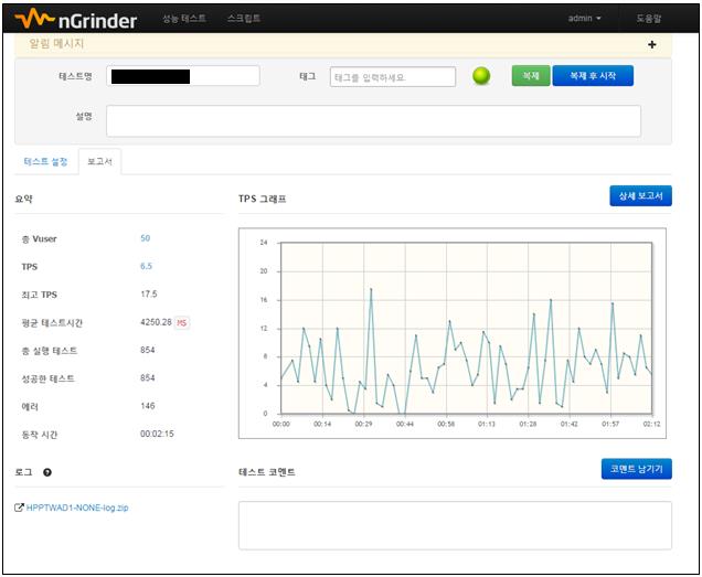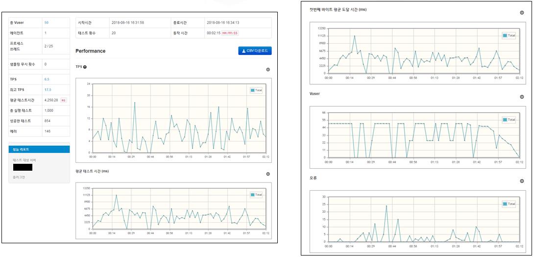 상세보고서 화면에서는 TPS, 평균 테스트 시간, 첫 바이트 평균 도달 시간 등 다양한 정보를 차트로 확인할 수 있습니다.