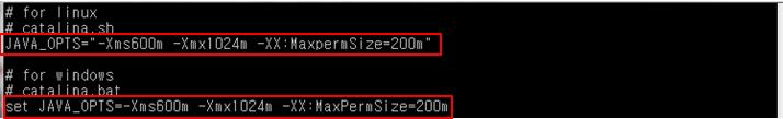 ${TOMCAT_HOME}/bin/catalina.sh(리눅스) 또는 ${TOMCAT_HOME}/bin/catalina.sh(윈도우) 파일을 열어 가장 앞 부분에 다음과 같이 메모리 설정을 추가합니다.