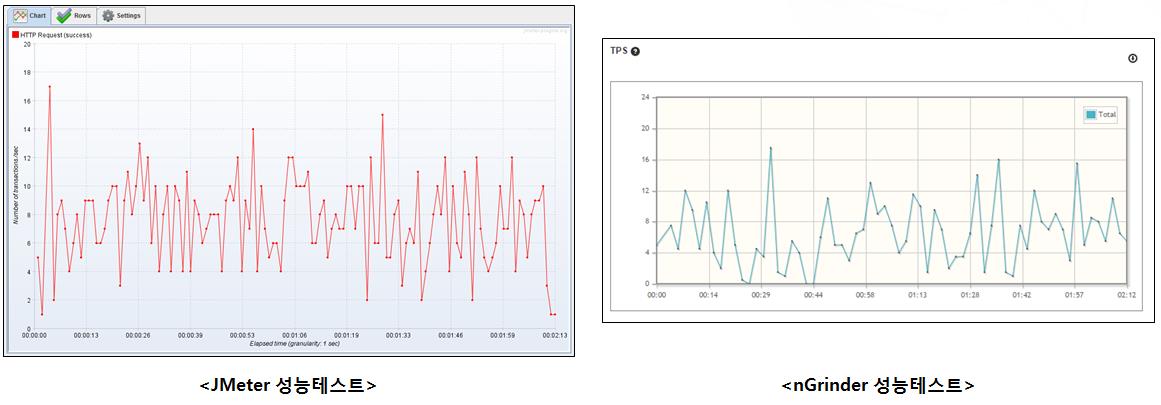 두 차트는 시간에 따른 TPS 처리량으로 비슷한 형태의 모양을 나타냅니다. 총 처리 시간은 2:13, 2:12로 거의 동일하며, 최고 TPS, 평균 TPS도 비슷한 값을 가지는 것을 확인할 수 있습니다.