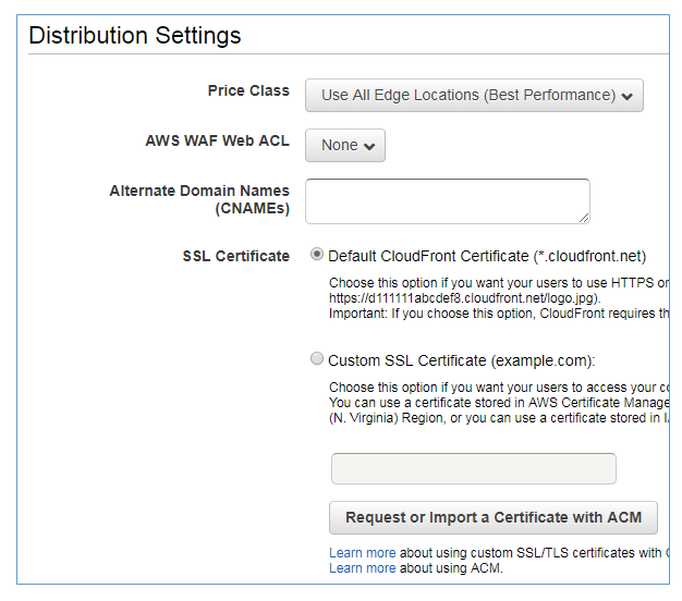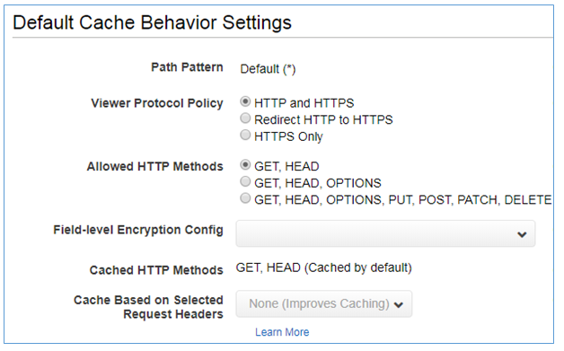 프로토콜, 캐시 유지기간, 쿠키 전달, 쿼리 문자열 전달, URL 제한 등 설정