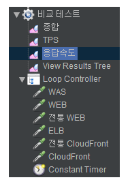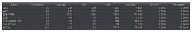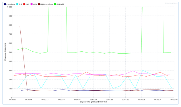 ② 아래는 응답속도를 그래프로 나타낸 것이며, CloudFront = 전통 CloudFront > ELB > WEB = WAS > 전통 WEB 순으로 나왔습니다.