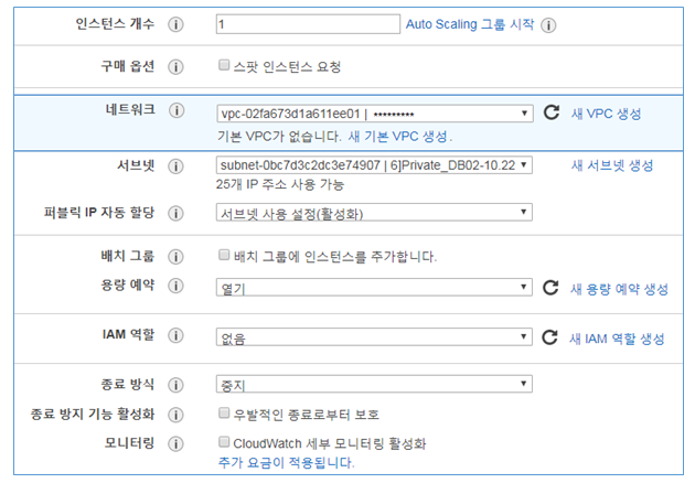 인스턴스 개수, 스팟 옵션, VPC, 가용영역, 퍼블릭 IP, IAM, 삭제방지, 모니터링 등 설정