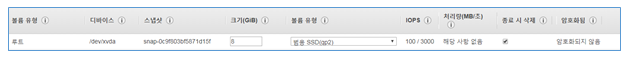 Root 장치는 필수이며 EBS만 사용가능, 장치 이름, ID, 스토리지 크기, 볼륨 유형, 삭제 방지 등 설정