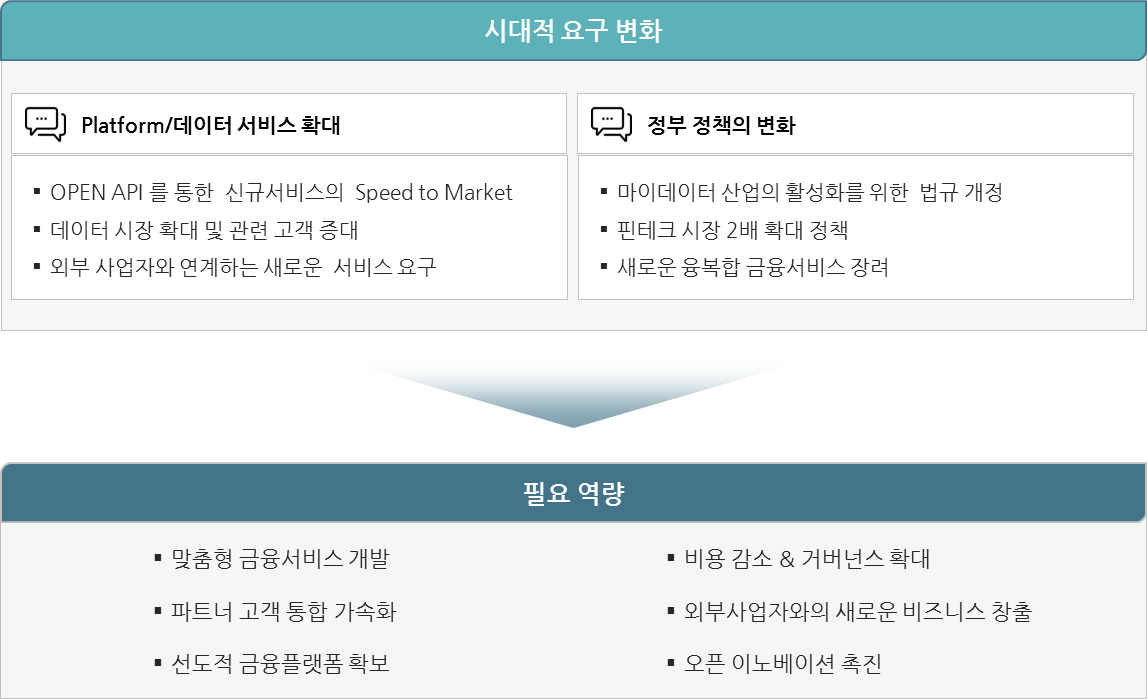 4차 산업혁명, 핀테크 산업의 영향으로 전 세계적으로 데이터 경제가 활발짐에 따라 국내에서도 마이데이터 산업 활성화를 위한 법규 개정, 핀테크 시장 확대 정책, 융복합 금융서비스를 장려하는 등 다양한 정부 정책의 변화가 일어나고 있습니다.