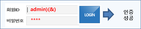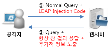 ▶ 외부 입력값이 LDAP(Lightweight Directory Access Protocol) 조회를 수행하기 위한 필터 생성에 사용되는 경우 필터 규칙을 변경 할 수 있는 입력값에 대한 검증 작업을 수행하지 않아 발생되는 취약점