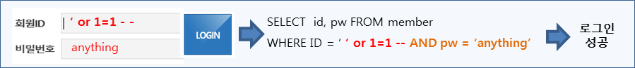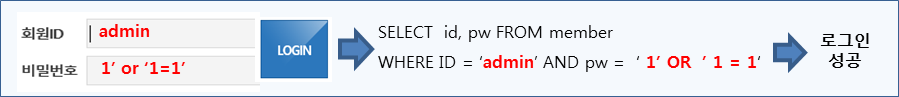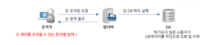 ▶ 데이터베이스와 연동되어 있는 어플리케이션의 입력된 데이터에 대한 유효성을 검증하지 않을 경우, 공격자가 입력 폼 및 URL에 SQL문을 삽입하여 DB로부터 정보를 열람하거나 조작할 수 있는 보안 취약점