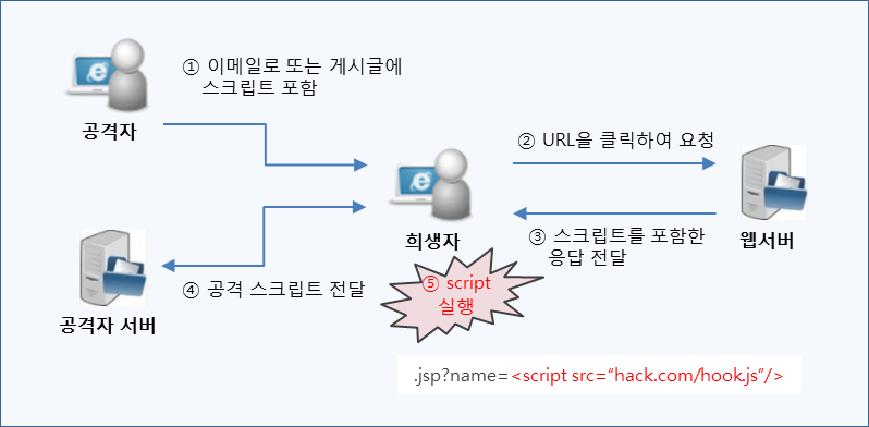 ▶ 웹 페이지에 악의적인 스크립트를 포함시켜 웹페이지를 열람하는 접속자의 권한으로 부적절한 스크립트가 수행되어 정보유출 등의 공격을 유발할 수 있다.