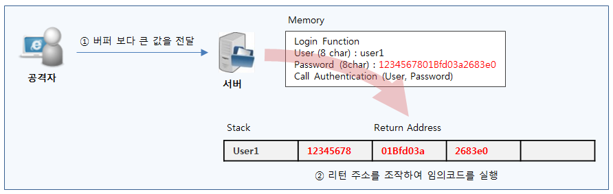 ▶ (버퍼오버플로우) 스택(Stack)이나 힙(Heap)에 할당되는 메모리에 문자열 등이 저장될 때 최초 정의된 메모리의 크기를 초 과하여 문자열을 저장하는 경우 버퍼오버플로우가 발생한다.