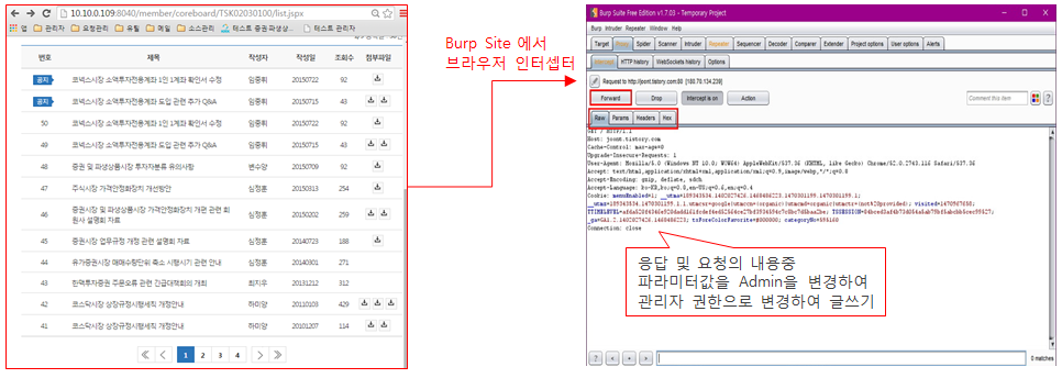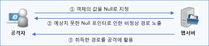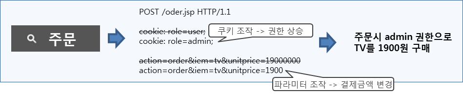 ▶ 사용자가 전달하는 쿠키, 환경변수, 히든필드의 사용자권한을 나타내는 변수를 조작한 뒤 서버로 요청하거나, 허용된 값을 넘어서도록 변조하거나, 공격자가 의도적으로 널 포인터 역참조를 발생시키는 등 오류를 발생시켜 공격