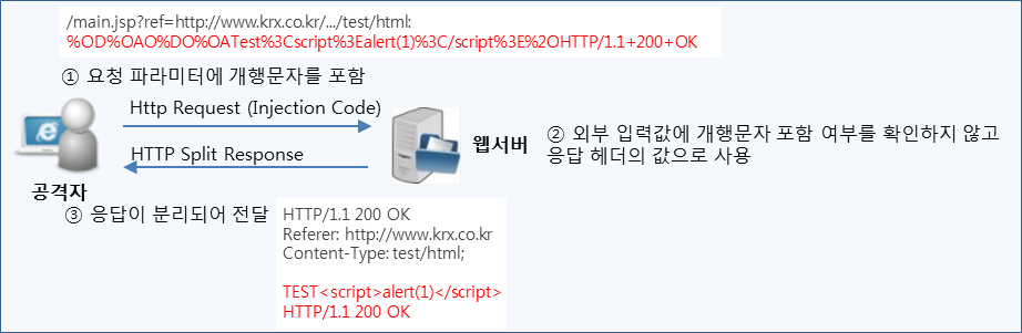 ▶ 공격자가 HTTP 요청에 삽입한 인자값이 응답헤더에 포함되어 사용자에게 전달될 때 첫 번째 응답을 종료시키고 두 번째 응답의 악의적인 코드가 실행되거나, 사용자의 입력값을 외부 사이트의 주소로 사용하여 자동으로 위험한 URL로 접속 유도