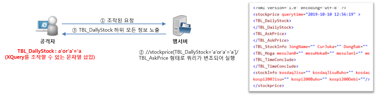 ▶ XML 문서를 조회할 경우 입력 값 조작을 통해 XQurey나 XPath와 같은 쿼리문 구조를 임의로 변경하여 허가되지 않은 데이터를 조회하거나 인증 절차를 우회하는 취약점