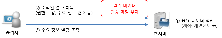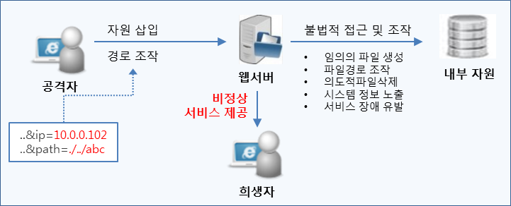 ▶ 공격자가 입력값 조작을 통해 시스템이 보호하는 자원에 임의로 접근하거나, 적절한 검증절차를 거치지 않은 사용자 입력값에 의해 의도하지 않은 시스템 명령어가 실행되어 운영에 악영향을 미칠 수 있는 취약점이다.