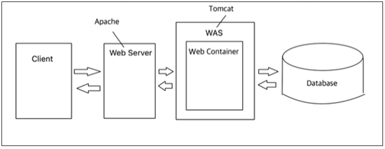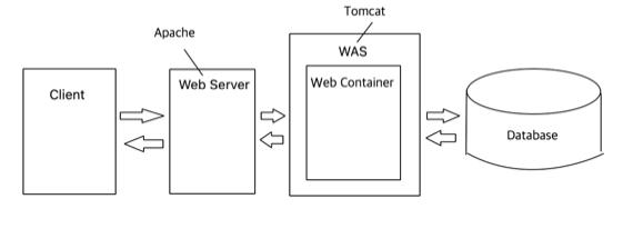 Web Server와 WAS를 별도로 구성한다고 했을 때 위에서 단순화 시켰던 Server - Client 구조를 다시 그리면 위의 그림과 같은 구조라고 할 수 있습니다.