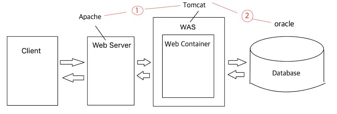 Client 에서 Server로 요청을 보내면 Web Server로 요청이 갑니다. 그리고 해당 요청에 동적인 데이터가 필요하다면 그 요청을 다시 WAS로 보냅니다. 그리고 WAS에서도 DB에 접속을 해서 해당 데이터를 가지고 올 수 있습니다.