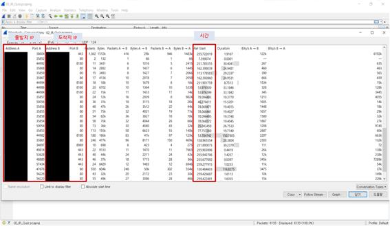* Conversation – 출발지 IP, 도착지 IP, 크기, 시간등 IP에 대한 정보를 확인할 수 있다.