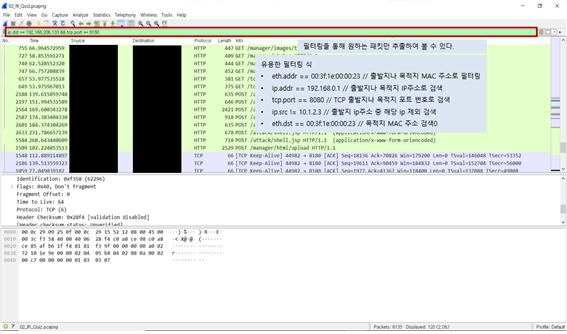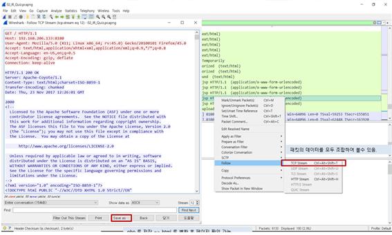 Statistics를 이용하여 대략적인 패킷의 분석이 끝났으면 필터링과 Stream을 통해 자세한 내용을 확인하면 된다.