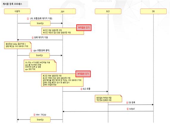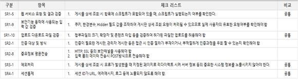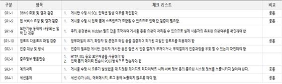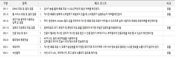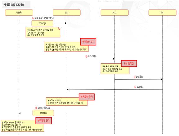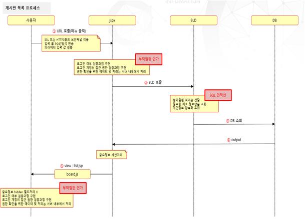 게시판 목록을 구현할 때, 필요한 보안 사항의 시퀀스 다이어그램과 체크리스트이다.