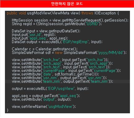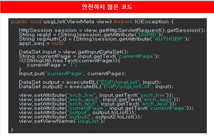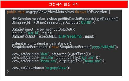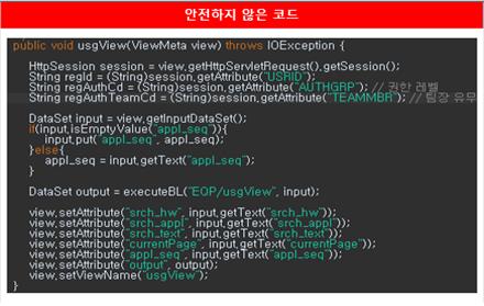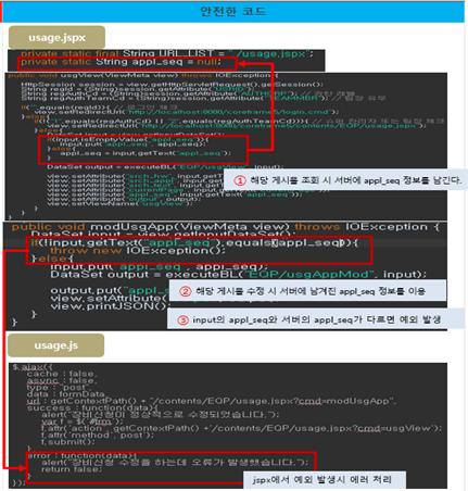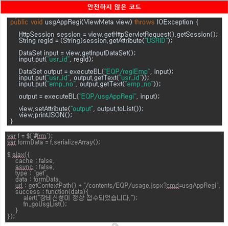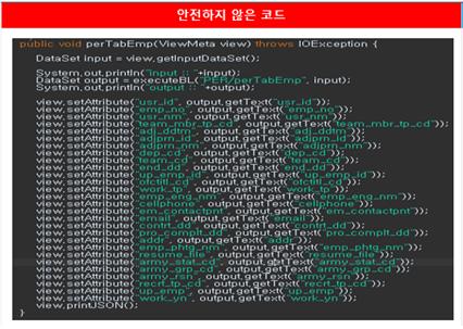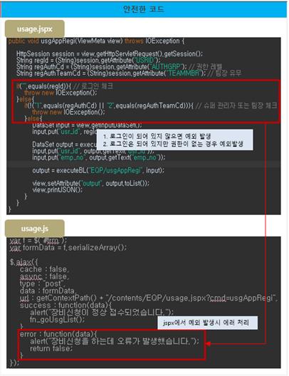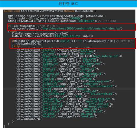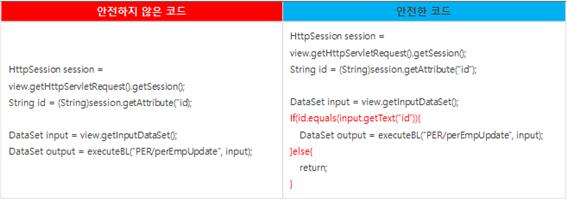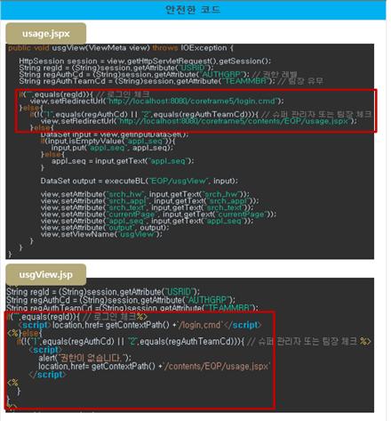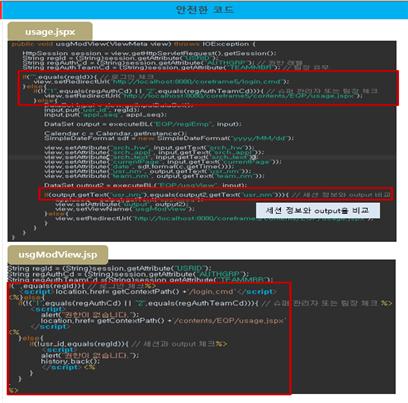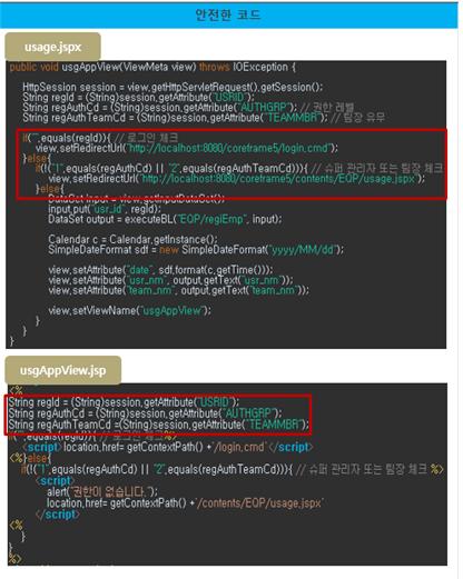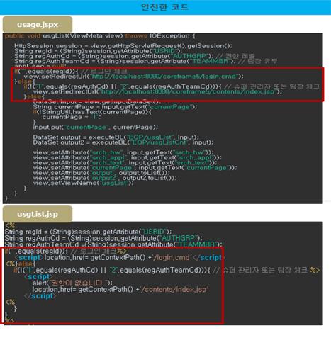 위의 코드는 인증대상 및 방식(SR2-1)에 대한 안전하지 않은 코드와 안전한 코드의 예시이다.