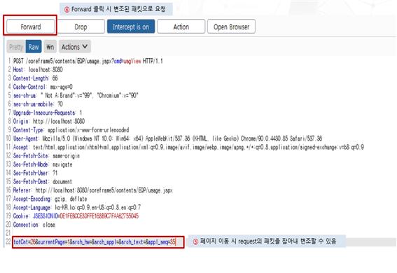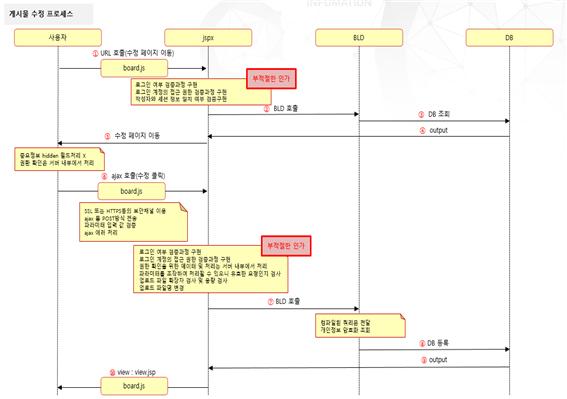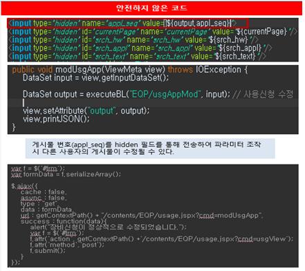 게시판 수정 페이지 접근 시 파라미터 변조를 통해 타 사용자의 게시물의 수정 페이지에 접근하여 정보를 확인하고 무단으로 수정을 할 수 있으므로 로그인 세션 정보와 output을 비교하여 검증해야 한다.