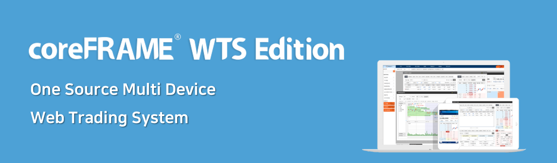 coreFRAME WTS Edition은 웹표준 및 웹접근성 준수, 대용량 데이터의 실시간 처리, One Source Multi Use, 손쉬운 유지보수를 지원하며 한국투자증권, 한화투자증권, 신한금융투자 등 대형 금융사에서 사용하고 있는 검증된 솔루션입니다.
